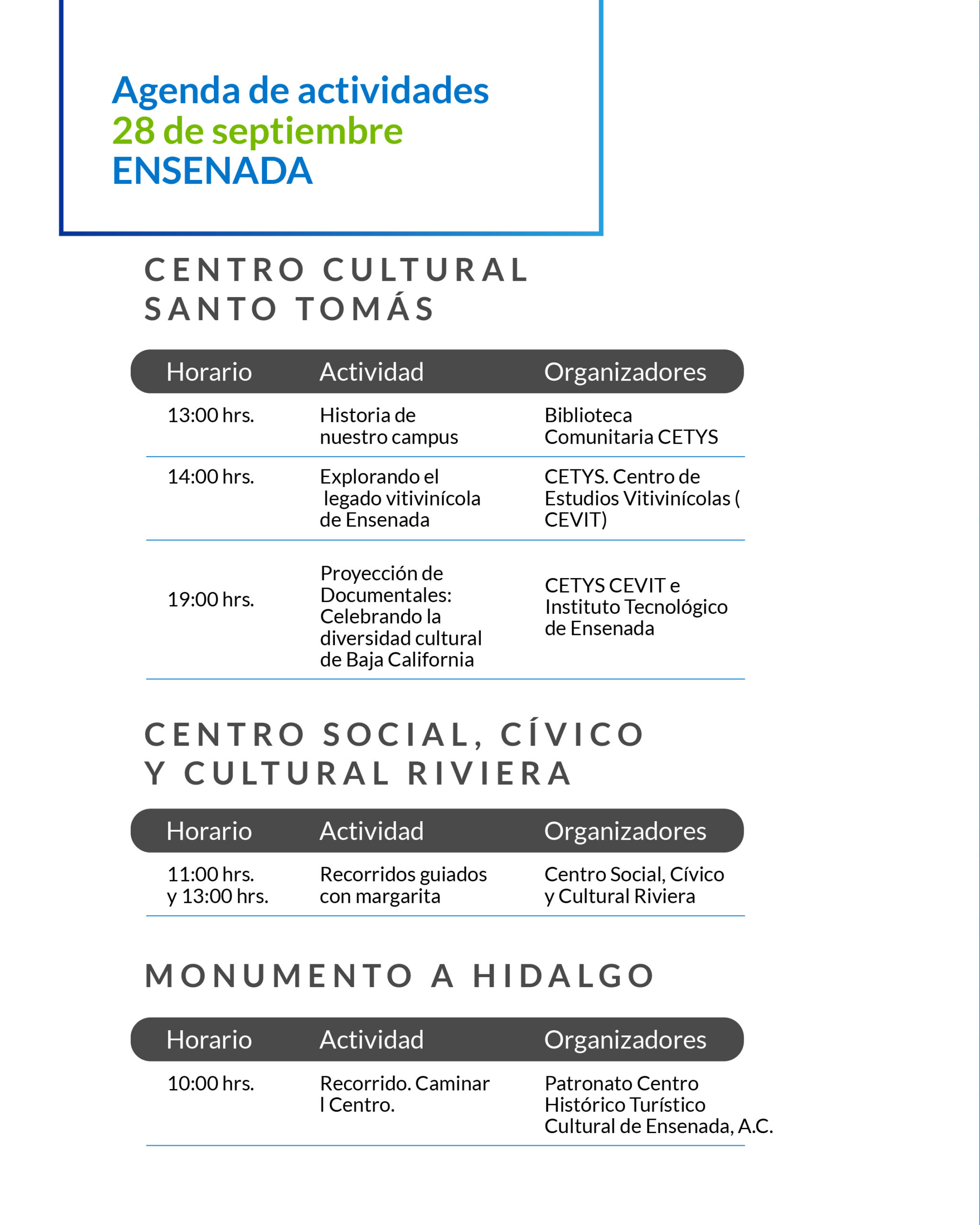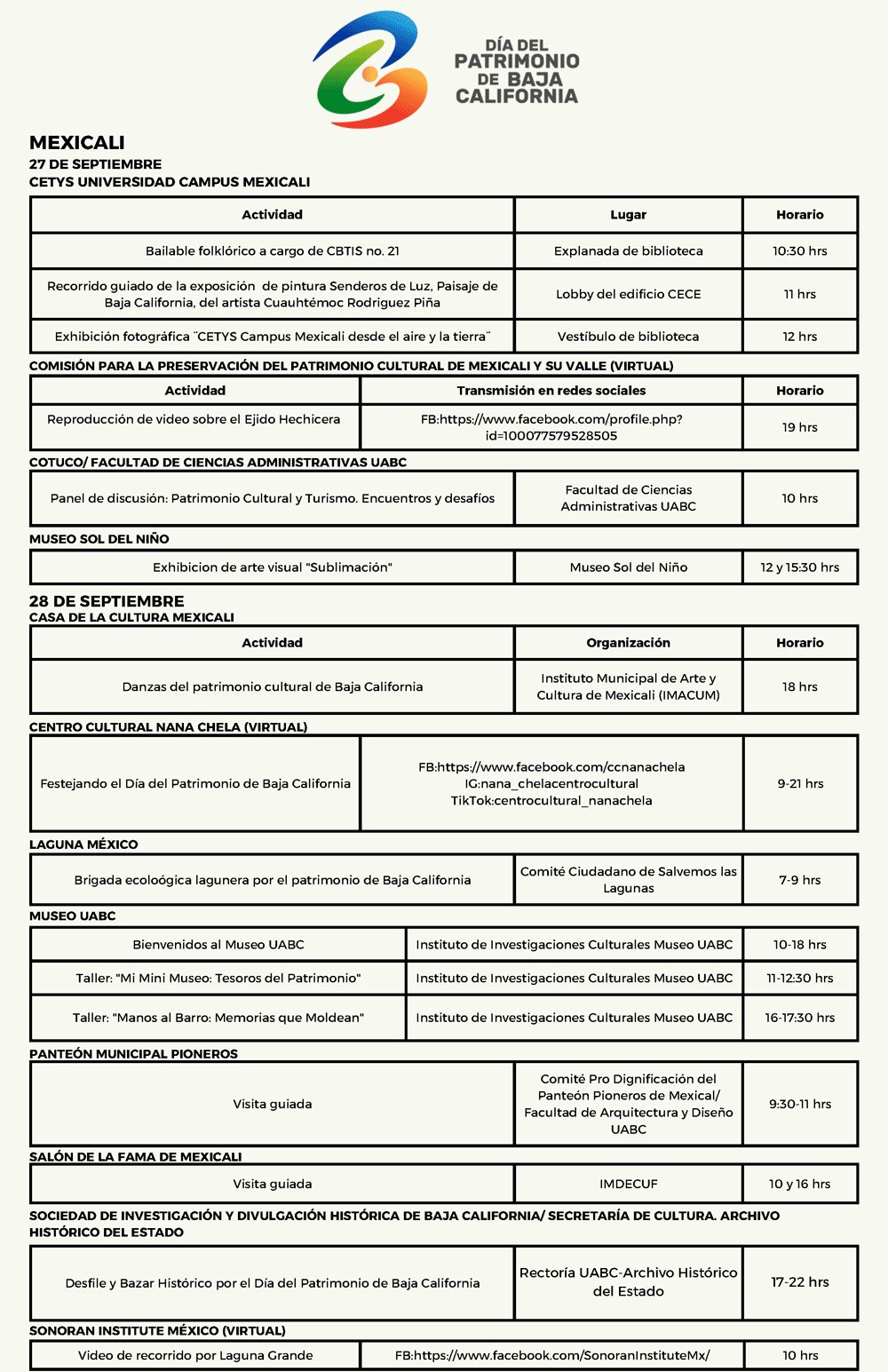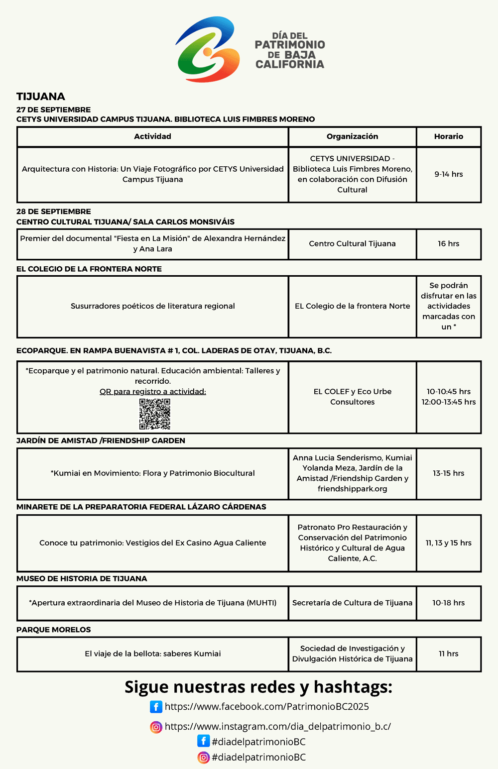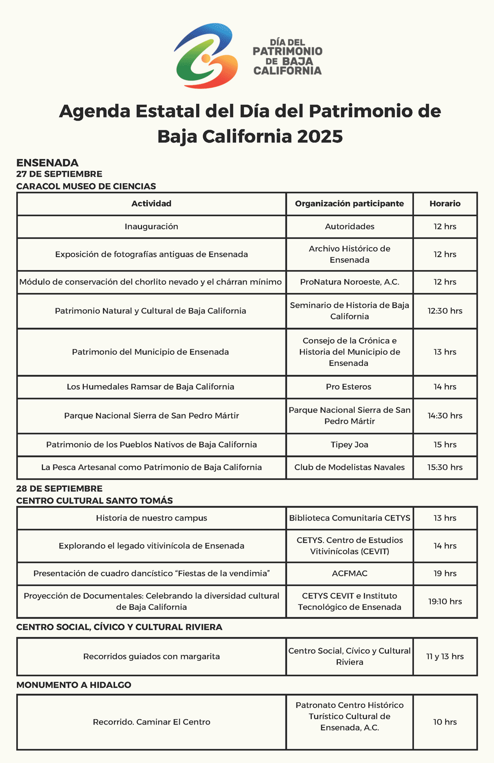 La agenda completa de actividades puede consultarse aquí abajo o también en las redes sociales Patrimonio B.C. (en Instagram y Facebook), donde se encuentra la invitación abierta a toda la población.