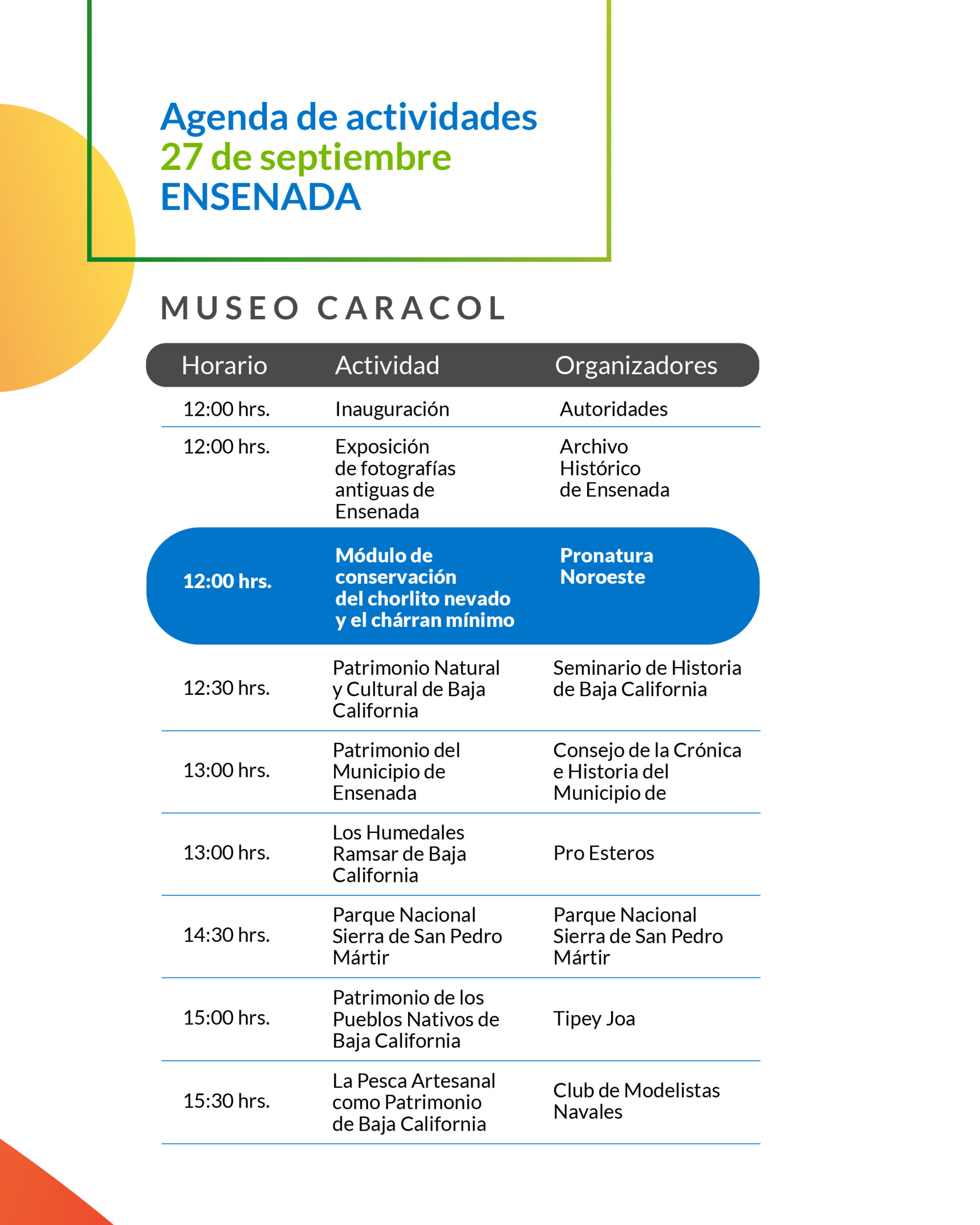 Uno de los eventos centrales será el Patrimonio Fest en Ensenada, organizado en el Caracol Museo de Ciencias, con la participación de Pronatura Noroeste, donde se realizarán talleres y actividades alusivas a la conservación ambiental y cultural.