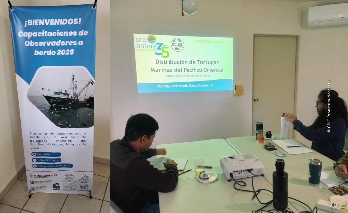 En Pronatura Noroeste, junto con el Centro Interdisciplinario de Ciencias Marinas (Cicimar) y Fishing Data, capacitamos a observadores a bordo de la flota de pelágicos menores del Pacífico mexicano para proteger tortugas marinas y avanzar hacia una pesca más sostenible.