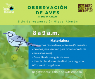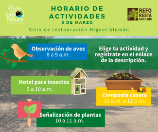 Te invitamos los sábados 5, 12 y 19 de marzo a comprobar la transformación de este sitio natural. Podrás contemplar y escuchar a las aves que ahí habitan, como las palomas de collar, los chipes y los chipes amariilos, recorrer los senderos del sitio, respirar el aire puro en compañía de tu familia y de tus amigos. También podrás disfrutar de las actividades que hemos programado para ti, para aprovechar al máximo la visita al sitio de Reforestación Miguel Alemán.