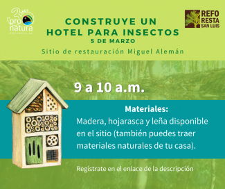 Iniciaremos en punto de las 8 de la mañana, con el acercamiento a las aves residentes con la guía de nuestros biólogos y expertos en la observación de aves. A las 9 de la mañana dará el taller para construir “hoteles para insectos”, como parte del proyecto de construcción de un jardín con plantas y arbustos nativos para atraer a insectos y aves polinizadoras.